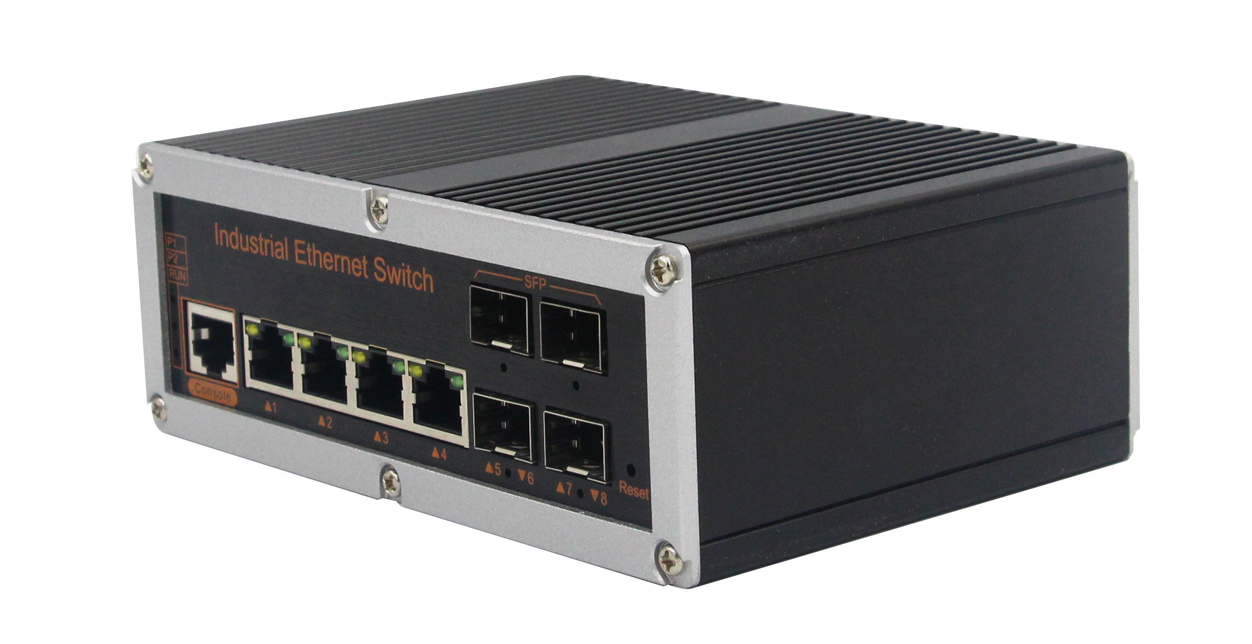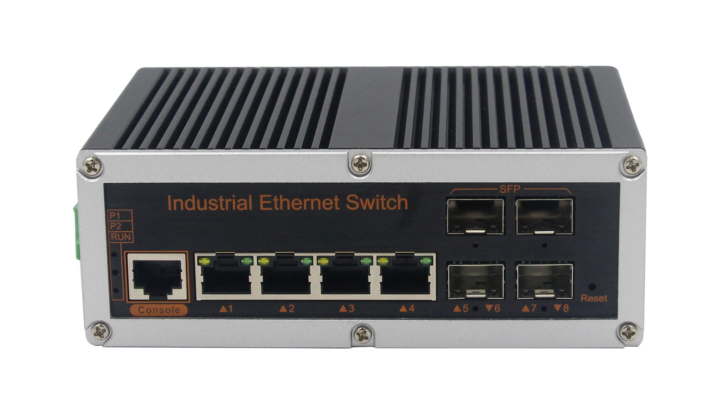 網管型千兆4光4電系列工業以太網交換機,產品符合FCC、CE、ROHS標準。支持4個千兆光口和4個千兆電口,支持一路console口;支持工業現場所需的以太網二層協議,保證通信網絡的穩定性;該系列交換機采用低功耗、無風扇設計,確保無噪聲干擾,同時支持-40~85℃工作溫度和良好的EMC電磁兼容性能,保證在惡劣的工業環境中保持穩定的工作,為工廠自動化,智能交通,視頻監控等工業應用領域組建快速穩定的網絡終端接入網絡提供安全可靠的解決方案。護等級的外殼及 LED 指示燈,使之成為一個即插即用的工業級設備,為用戶的以太網設備聯網提供可靠、便捷的解決方案。