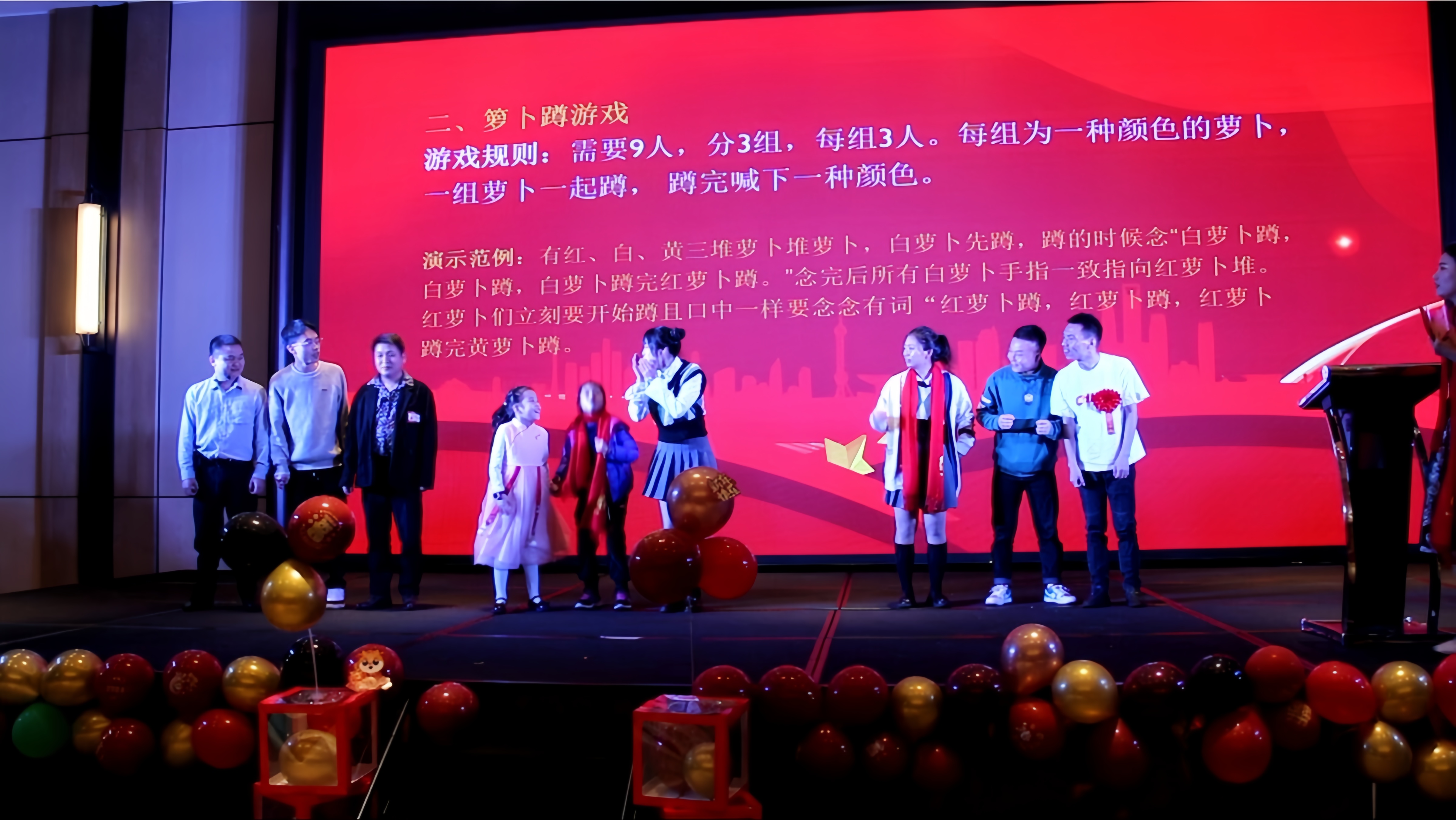 在年會的歡樂氛圍中,還有兩個充滿趣味性的游戲——搶凳子和蘿卜蹲。隨著歡快的音樂聲響起,搶凳子游戲正式開始,參與者們圍繞著凳子轉(zhuǎn)圈,眼睛緊盯著凳子,耳朵聆聽著主持的口令,當(dāng)音樂突然停止時,他們需要迅速找到一個凳子坐下。一時間,現(xiàn)場充滿了歡笑聲和緊張的氣氛。緊接著是充滿趣味性的蘿卜蹲游戲,參與者們展現(xiàn)出活力的身姿。他們根據(jù)指定的口號,一蹦一跳地輪流蹲下起立,仿佛一群活潑的蘿卜在舞動。在這個游戲中,不僅鍛煉了身體協(xié)調(diào)能力,還考驗著團隊之間的默契。