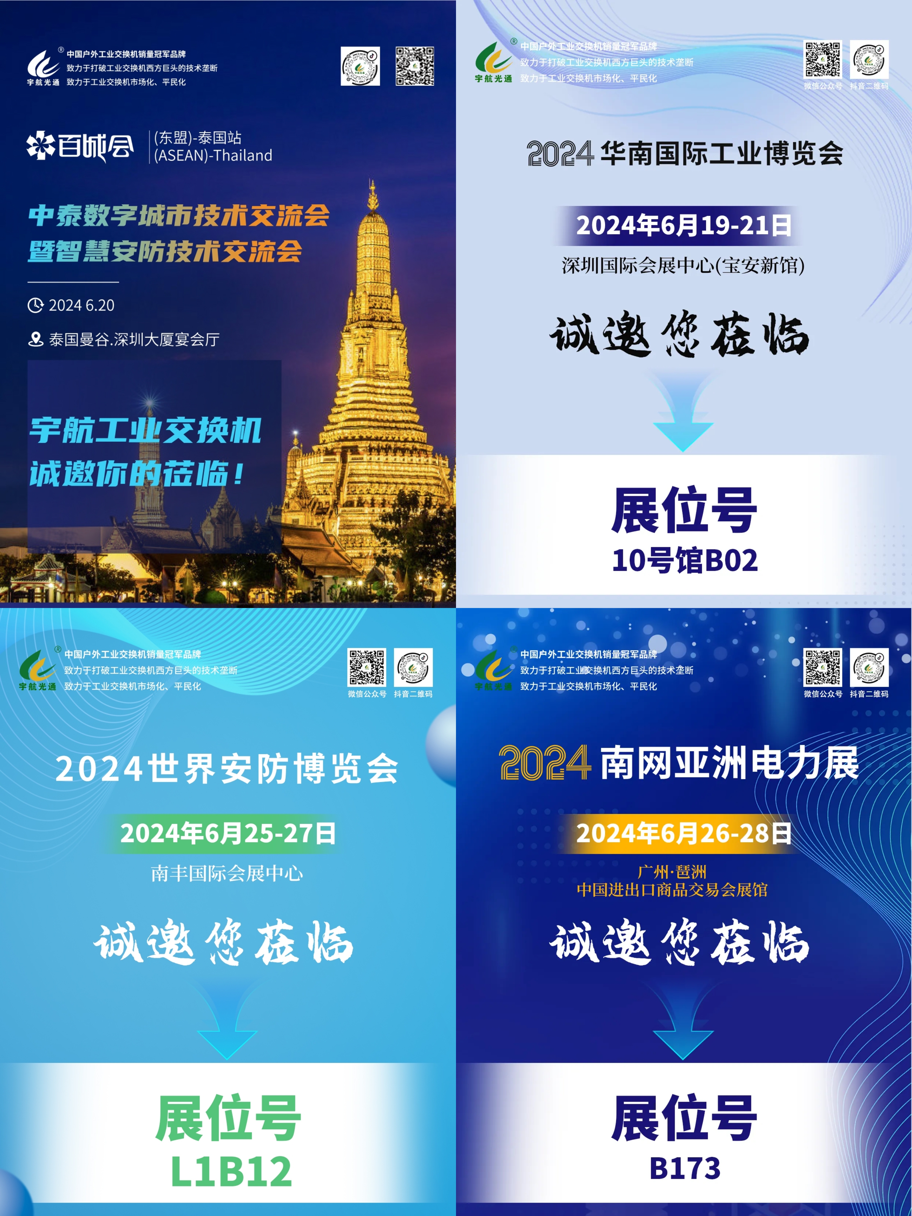六月下旬,宇航工業(yè)交換機繼續(xù)與您相約國內(nèi)外各大城市,深圳,泰國曼谷,湖南湘潭,湖北宜昌、恩施、廣西來賓、廣州、上海等地!宇航工業(yè)交換機期待您的蒞臨!