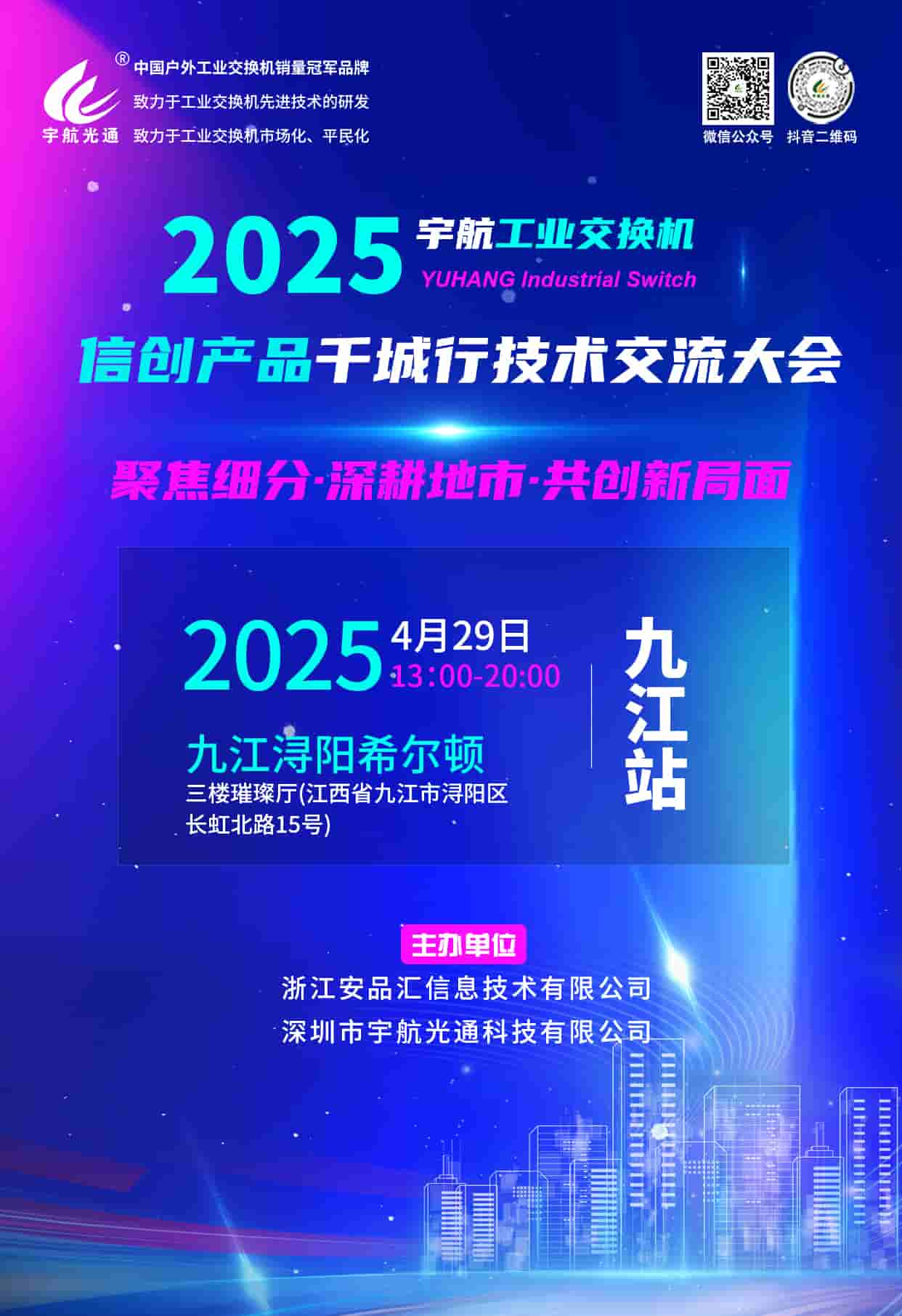 2025年4月23日至4月25日,中國戶外工業(yè)交換機銷量冠軍品牌——宇航工業(yè)交換機再度展現(xiàn)強勁市場布局,密集亮相全國六大行業(yè)盛會:第十五屆中國國際道路交通安全產(chǎn)品博覽會(武漢)、成都國際工業(yè)博覽會、東北安博會,以及江西宜春、撫州和陜西西安的2025信創(chuàng)產(chǎn)品千城行技術(shù)交流大會。