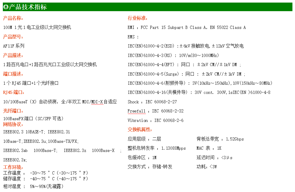 1路百兆電口+1路百兆SC光口工業(yè)級(jí)以太網(wǎng)交換機(jī),支持1個(gè)10Base-T/100Base-TX電口和1個(gè)100Base-X光口。產(chǎn)品符合FCC、CE、ROHS標(biāo)準(zhǔn)。AF11F系列交換機(jī)具有-30℃~75℃的工作溫度,具有超強(qiáng)的堅(jiān)固度能適應(yīng)各種嚴(yán)苛環(huán)境,也可以非常方便的安置在空間緊湊的控制箱中。導(dǎo)軌的安裝特性、寬溫操作及擁有IP40防護(hù)等級(jí)的外殼及LED指示燈,使AF11F成為一個(gè)即插即用的工業(yè)級(jí)設(shè)備,為用戶的以太網(wǎng)設(shè)備聯(lián)網(wǎng)提供可靠、便捷的解決方案。