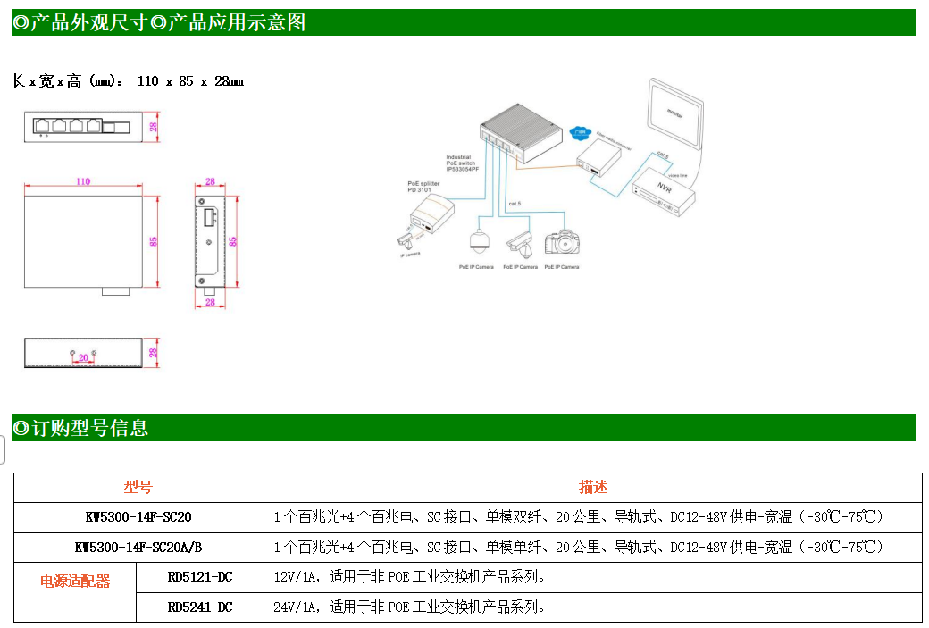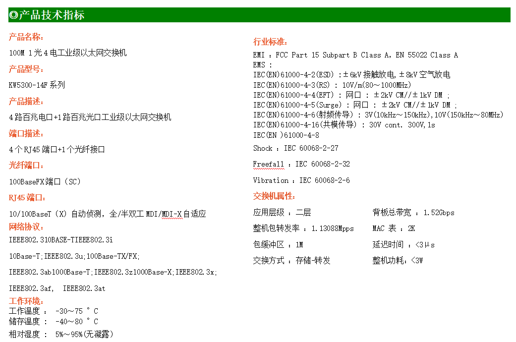 4路百兆電口+1路百兆FX光口工業(yè)級以太網(wǎng)交換機,支持4個10Base-T/100Base-TX電口和1個100Base-X光口。產(chǎn)品符合FCC、CE、ROHS標(biāo)準(zhǔn)。KW5300-14F系列交換機具有-30℃~75℃的工作溫度,具有超強的堅固度能適應(yīng)各種嚴(yán)苛環(huán)境,也可以非常方便的安置在空間緊湊的控制箱中。導(dǎo)軌的安裝特性、寬溫操作及擁有IP40防護等級的外殼及LED指示燈,使AF14F成為一個即插即用的工業(yè)級設(shè)備,為用戶的以太網(wǎng)設(shè)備聯(lián)網(wǎng)提供可靠、便捷的解決方案。