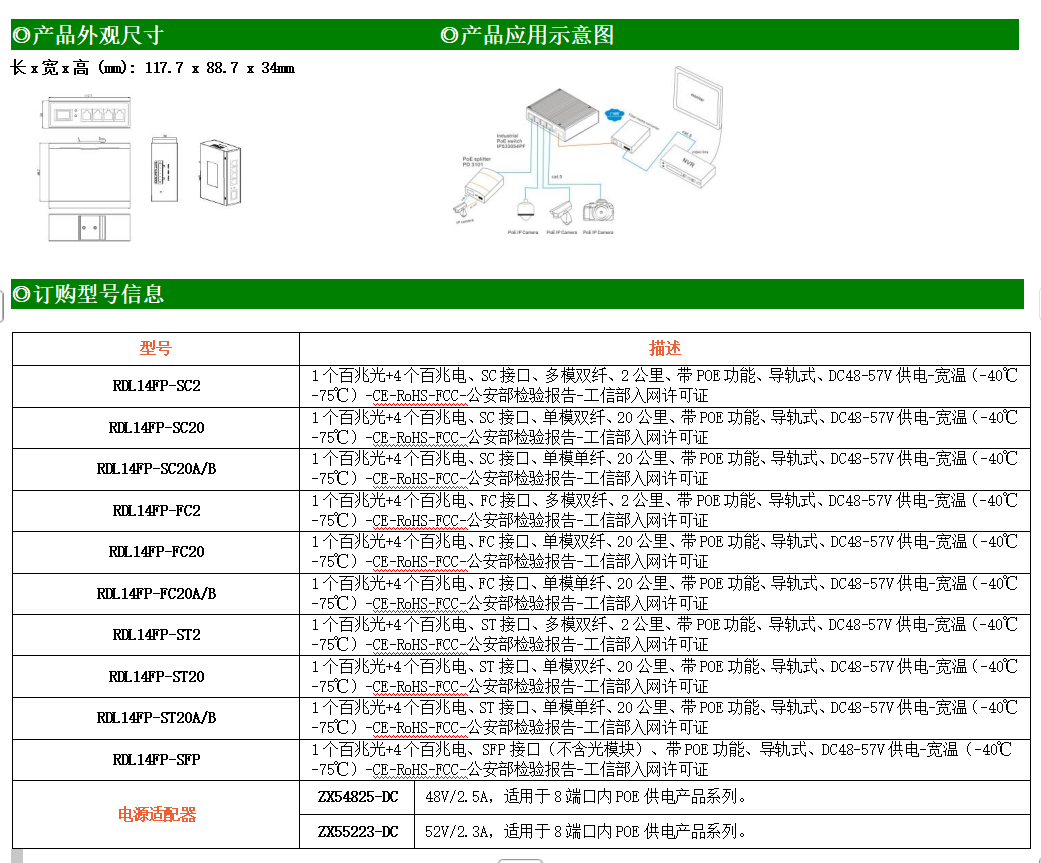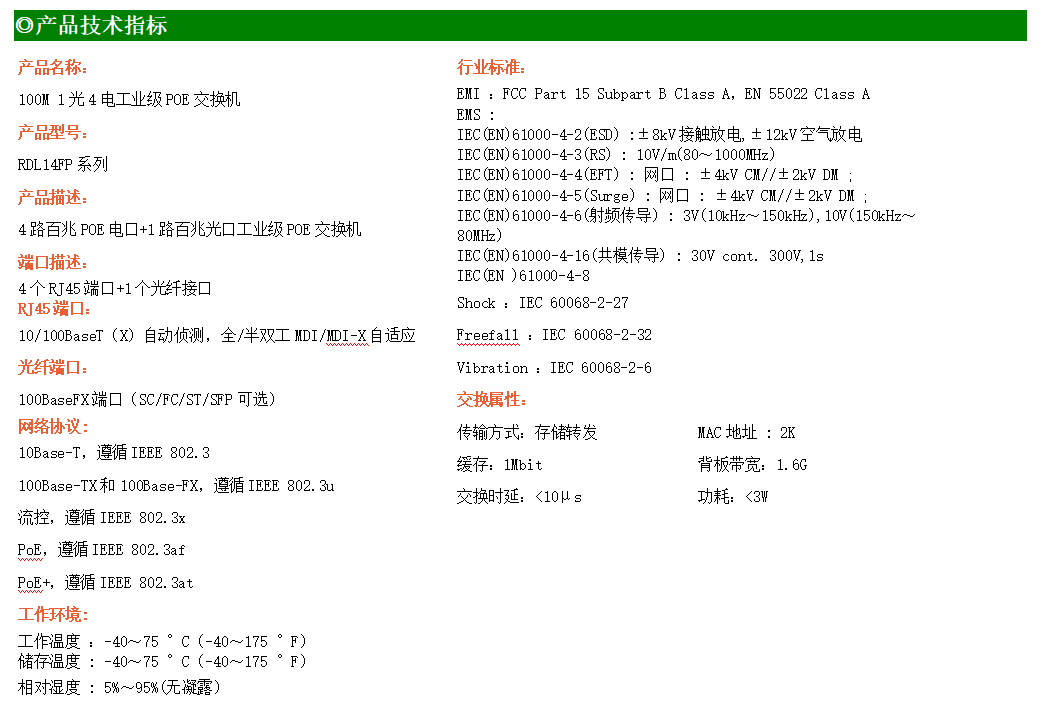 4路百兆POE電口+1路百兆SFP光口工業級以太網POE交換機,支持4個10/100Base-TX電口和1個100Base-X光口。產品符合FCC、CE、ROHS標準。RDL14FP系列交換機具有-40℃~75℃的工作溫度,具有超強的堅固度能適應各種嚴苛環境,也可以非常方便的安置在空間緊湊的控制箱中。導軌的安裝特性、寬溫操作及擁有IP40防護等級的外殼及LED指示燈,使RDL14FP成為一個即插即用的工業級設備,為用戶的以太網設備聯網提供可靠、便捷的解決方案。