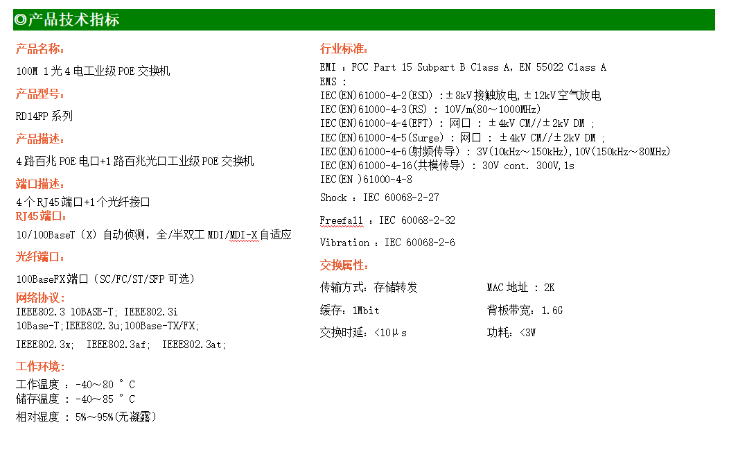 4路百兆POE電口+1路百兆SC光口工業級以太網POE交換機,支持4個10/100Base-TX電口和1個100Base-X光口。產品符合FCC、CE、ROHS標準。RD14FP系列交換機具有-40℃~80℃的工作溫度,具有超強的堅固度能適應各種嚴苛環境,也可以非常方便的安置在空間緊湊的控制箱中。導軌的安裝特性、寬溫操作及擁有IP40防護等級的外殼及LED指示燈,使RD14FP成為一個即插即用的工業級設備,為用戶的以太網設備聯網提供可靠、便捷的解決方案。