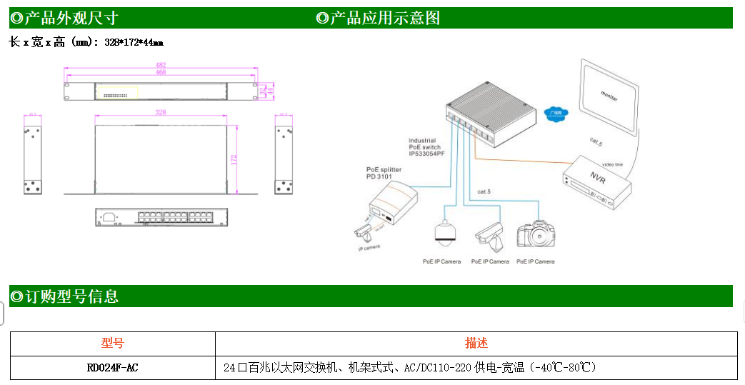24路百兆電口工業級以太網交換機,支持24個10Base-T/100Base-TX電口。產品符合FCC、CE、ROHS標準。RD024F交換機具有-40℃~80℃的工作溫度,具有超強的堅固度能適應各種嚴苛環境,也可以非常方便的安置在空間緊湊的控制箱中。機架式的安裝特性、寬溫操作及擁有IP40防護等級的外殼及LED指示燈,使RD024-AC成為一個即插即用的工業級設備,為用戶的以太網設備聯網提供可靠、便捷的解決方案。