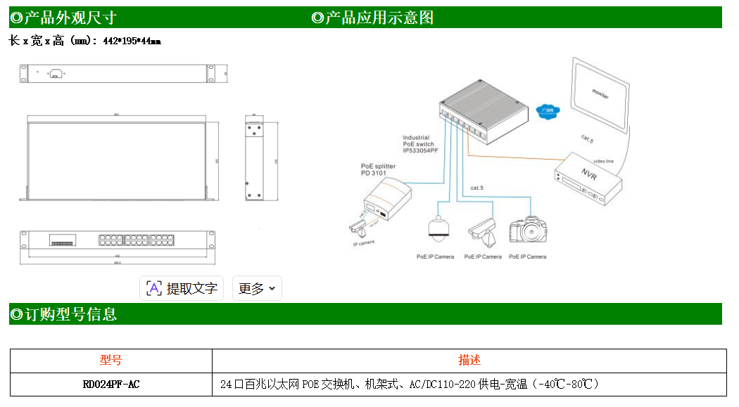 24路百兆POE電口工業級以太網交換機,支持24個10Base-T/100Base-TX電口,所有PoE端口符合IEEE802.3af/at標準。產品符合FCC、CE、ROHS標準。RD024FP-AC交換機具有-40℃~80℃的工作溫度,具有超強的堅固度能適應各種嚴苛環境,也可以非常方便的安置在空間緊湊的控制箱中。機架式的安裝特性、寬溫操作及擁有IP40防護等級的外殼及LED指示燈,使RD024FP-AC成為一個即插即用的工業級設備,為用戶的以太網設備聯網提供可靠、便捷的解決方案。