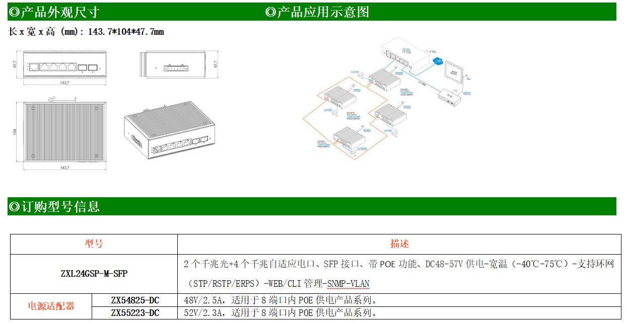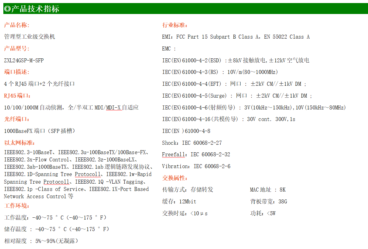 ZXL24GSP-M-SFP是網管型工業以太網POE交換機,產品符合FCC、CE、RoHS標準。支持2個千兆光口和4個千兆電口;支持工業現場所需的以太網二層協議,保證通信網絡的穩定性;該系列交換機采用低功耗、無風扇設計,確保無噪聲干擾,同時支持-40~75℃工作溫度和良好的EMC電磁兼容性能,保證在惡劣的工業環境中保持穩定的工作,為工廠自動化,智能交通,視頻監控等工業應用領域組建快速穩定的網絡終端接入網絡提供安全可靠的解決方案。