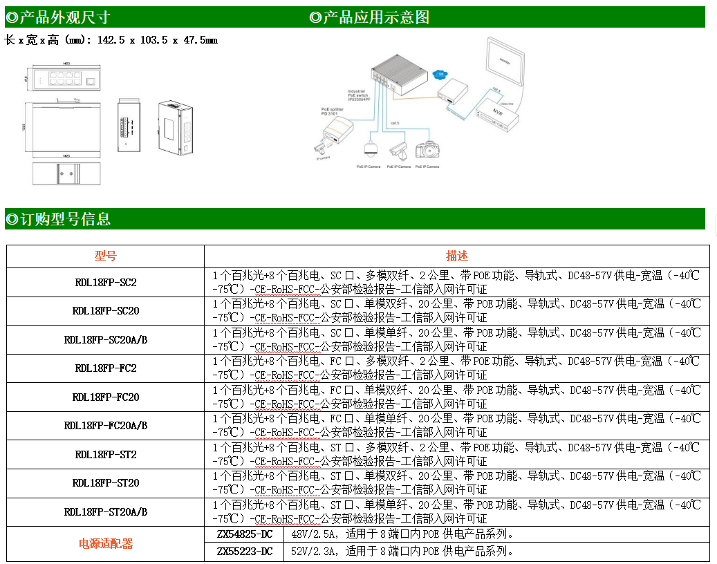 8路百兆POE電口+1路百兆FX光口工業(yè)級以太網(wǎng)POE交換機,支持8個10/100Base-TX電口和1個100Base-X光口。產(chǎn)品符合FCC、CE、ROHS標準。RDL18FP交換機具有-40℃~75℃的工作溫度,具有超強的堅固度能適應(yīng)各種嚴苛環(huán)境,也可以非常方便的安置在空間緊湊的控制箱中。導軌的安裝特性、寬溫操作及擁有IP40防護等級的外殼及LED指示燈,使RDL18FP成為一個即插即用的工業(yè)級設(shè)備,為用戶的以太網(wǎng)設(shè)備聯(lián)網(wǎng)提供可靠、便捷的解決方案。