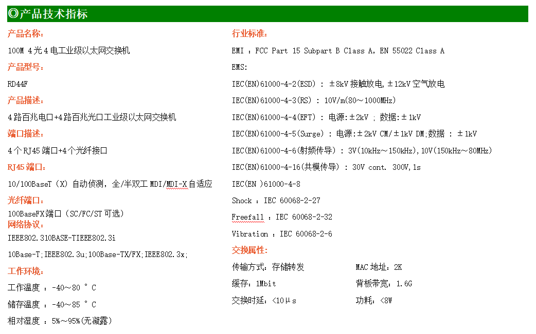 4路百兆電口+4路百兆光口工業級以太網交換機,支持4個10Base-T/100Base-TX電口和4個100Base-SFP光口。產品符合FCC、CE、ROHS標準。RD44F交換機具有-40℃~80℃的工作溫度,具有超強的堅固度能適應各種嚴苛環境,也可以非常方便的安置在空間緊湊的控制箱中。導軌的安裝特性、寬溫操作及擁有IP40防護等級的外殼及LED指示燈,使RD44F成為一個即插即用的工業級設備,為用戶的以太網設備聯網提供可靠、便捷的解決方案。
