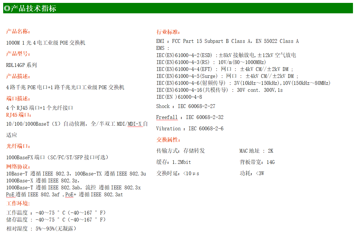 4路千兆POE電口+1路千兆FX光口工業級以太網POE交換機,支持4個10/100/1000Base-TX電口和1個1000Base-X光口。產品符合FCC、CE、ROHS標準。RDL14GP系列交換機具有-40℃~75℃的工作溫度,具有超強的堅固度能適應各種嚴苛環境,也可以非常方便的安置在空間緊湊的控制箱中。導軌的安裝特性、寬溫操作及擁有IP40防護等級的外殼及LED指示燈,使RDL14GP成為一個即插即用的工業級設備,為用戶的以太網設備聯網提供可靠、便捷的解決方案。