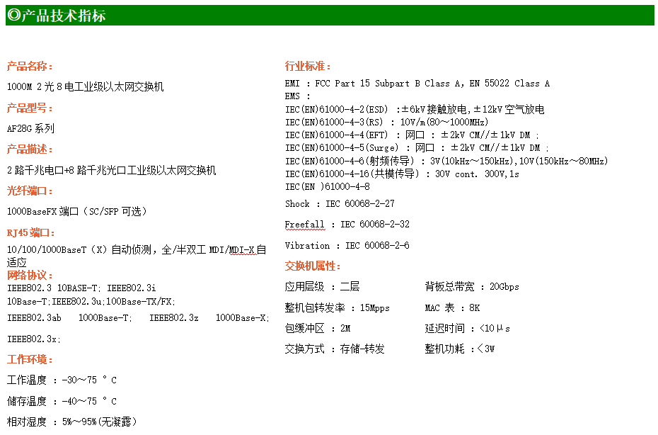 8路千兆電口+2路千兆FX光口工業級以太網交換機,支持8個100Base-T/1000Base-TX電口和2個1000Base-X光口。產品符合FCC、CE、ROHS標準。AF28G系列交換機具有-30℃~75℃的工作溫度,具有超強的堅固度能適應各種嚴苛環境,也可以非常方便的安置在空間緊湊的控制箱中。導軌的安裝特性、寬溫操作及擁有IP40防護等級的外殼及LED指示燈,使AF28G成為一個即插即用的工業級設備,為用戶的以太網設備聯網提供可靠、便捷的解決方案。