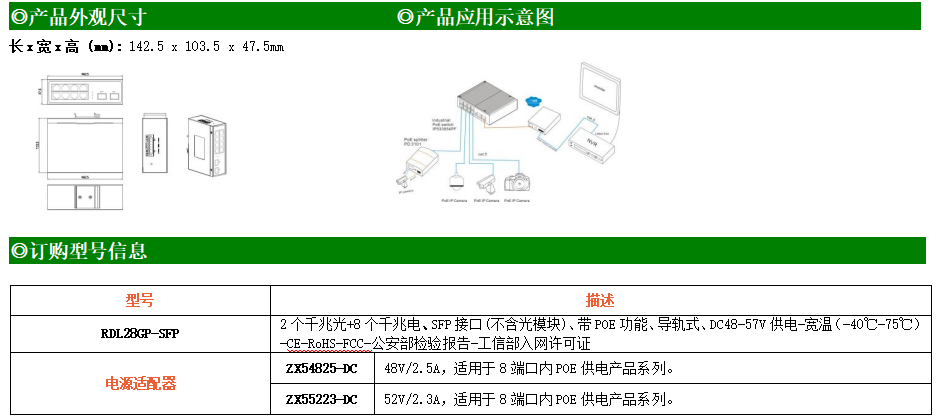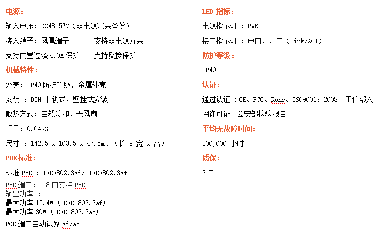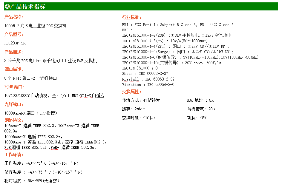 8路千兆POE電口+2路千兆FX光口工業(yè)級(jí)以太網(wǎng)POE交換機(jī),支持8個(gè)10/100/1000Base-TX電口和2個(gè)1000Base-X光口。產(chǎn)品符合FCC、CE、ROHS標(biāo)準(zhǔn)。RDL28GP-SFP交換機(jī)具有-40℃~75℃的工作溫度,具有超強(qiáng)的堅(jiān)固度能適應(yīng)各種嚴(yán)苛環(huán)境,也可以非常方便的安置在空間緊湊的控制箱中。導(dǎo)軌的安裝特性、寬溫操作及擁有IP40防護(hù)等級(jí)的外殼及LED指示燈,使RDL28GP-SFP成為一個(gè)即插即用的工業(yè)級(jí)設(shè)備,為用戶的以太網(wǎng)設(shè)備聯(lián)網(wǎng)提供可靠、便捷的解決方案。