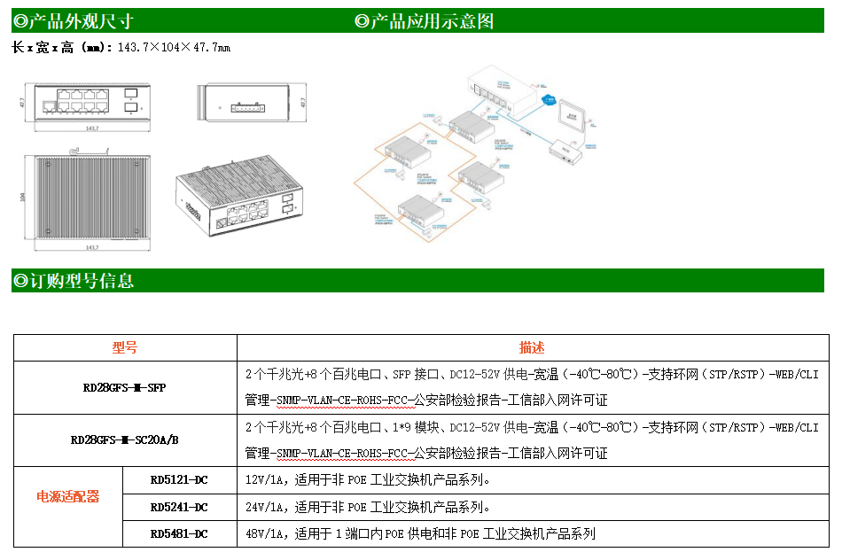 RD28GFS-M-SFP是網(wǎng)管型工業(yè)以太網(wǎng)交換機,產(chǎn)品符合FCC、CE、RoHS標準。支持2個千兆光口和8個百兆電口;支持工業(yè)現(xiàn)場所需的以太網(wǎng)二層協(xié)議,保證通信網(wǎng)絡(luò)的穩(wěn)定性;該系列交換機采用低功耗、無風扇設(shè)計,確保無噪聲干擾,同時支持-40~80℃工作溫度和良好的EMC電磁兼容性能,保證在惡劣的工業(yè)環(huán)境中保持穩(wěn)定的工作,為工廠自動化,智能交通,視頻監(jiān)控等工業(yè)應(yīng)用領(lǐng)域組建快速穩(wěn)定的網(wǎng)絡(luò)終端接入網(wǎng)絡(luò)提供安全可靠的解決方案。