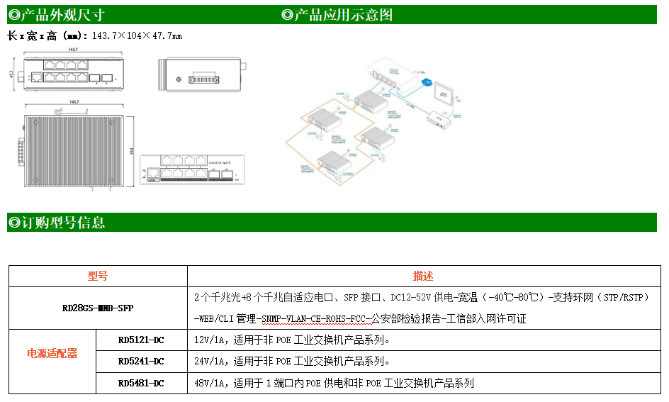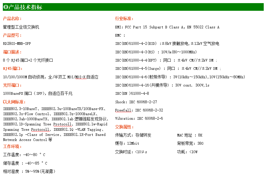 RD28GS-MNB是網管型工業(yè)以太網交換機,產品符合FCC、CE、RoHS標準。支持2個千兆光口和8個千兆電口;支持工業(yè)現(xiàn)場所需的以太網二層協(xié)議,保證通信網絡的穩(wěn)定性;該系列交換機采用低功耗、無風扇設計,確保無噪聲干擾,同時支持-40~85℃工作溫度和良好的EMC電磁兼容性能,保證在惡劣的工業(yè)環(huán)境中保持穩(wěn)定的工作,為工廠自動化,智能交通,視頻監(jiān)控等工業(yè)應用領域組建快速穩(wěn)定的網絡終端接入網絡提供安全可靠的解決方案。