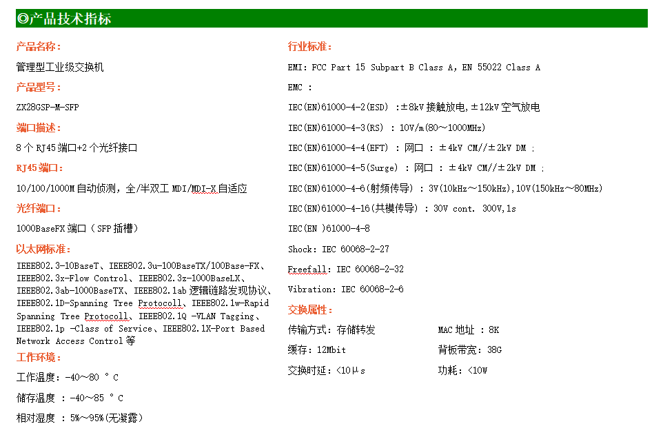 ZX28GSP-M是網管型工業以太網POE交換機,產品符合FCC、CE、RoHS標準。支持2個千兆光口和8個千兆電口;支持工業現場所需的以太網二層協議,保證通信網絡的穩定性;該系列交換機采用低功耗、無風扇設計,確保無噪聲干擾,同時支持-40~80℃工作溫度和良好的EMC電磁兼容性能,保證在惡劣的工業環境中保持穩定的工作,為工廠自動化,智能交通,視頻監控等工業應用領域組建快速穩定的網絡終端接入網絡提供安全可靠的解決方案。