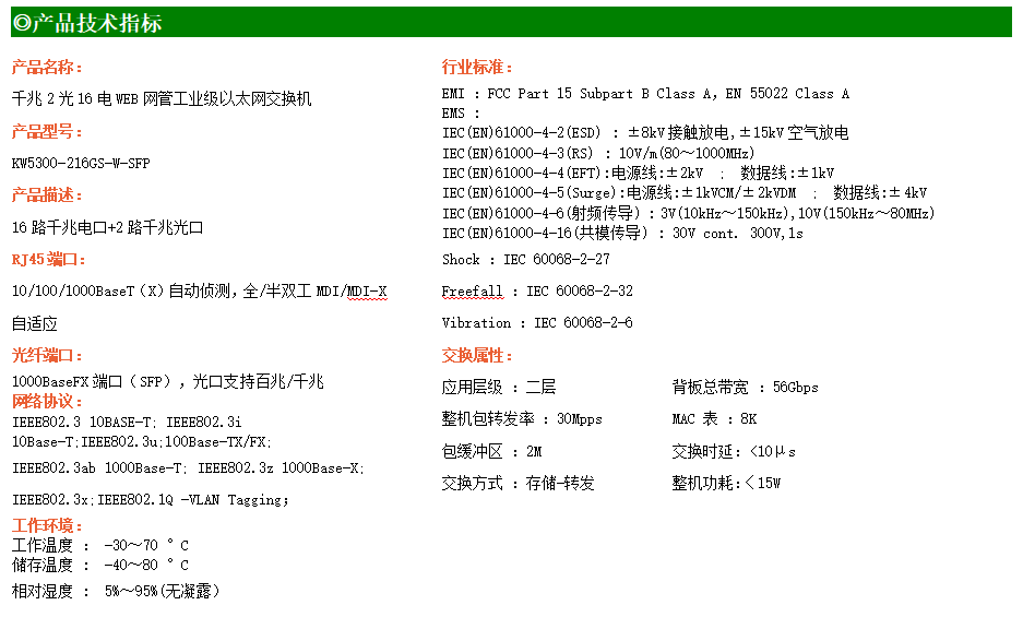 KW5300-216GFS-M-SFP是網管型工業以太網交換機,產品符合FCC、CE、RoHS標準。支持2個千兆光口和16個百兆電口;支持工業現場所需的以太網二層協議,保證通信網絡的穩定性;該系列交換機采用低功耗、無風扇設計,確保無噪聲干擾,同時支持-40~75℃工作溫度和良好的EMC電磁兼容性能,保證在惡劣的工業環境中保持穩定的工作,為工廠自動化,智能交通,視頻監控等工業應用領域組建快速穩定的網絡終端接入網絡提供安全可靠的解決方案。