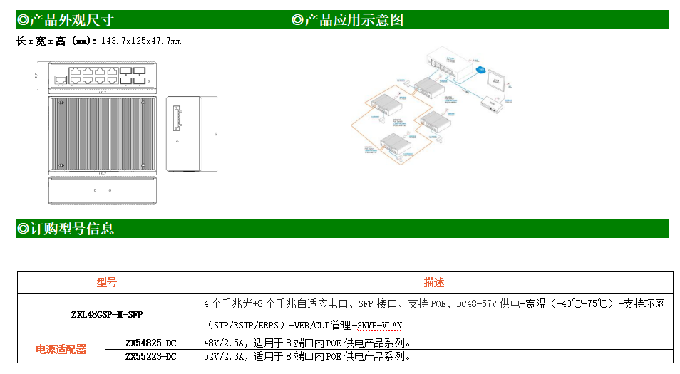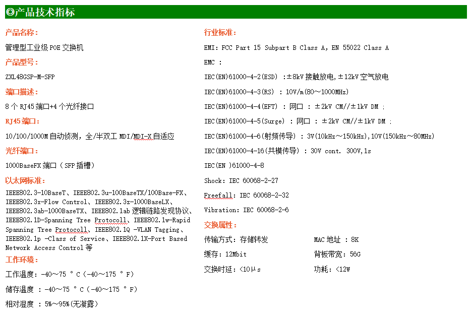 ZXL48GSP-M-SFP是網(wǎng)管型工業(yè)以太網(wǎng)POE交換機(jī),產(chǎn)品符合FCC、CE、RoHS標(biāo)準(zhǔn)。支持4個千兆光口和8個千兆電口;支持工業(yè)現(xiàn)場所需的以太網(wǎng)二層協(xié)議,保證通信網(wǎng)絡(luò)的穩(wěn)定性;該系列交換機(jī)采用低功耗、無風(fēng)扇設(shè)計(jì),確保無噪聲干擾,同時支持-40~75℃工作溫度和良好的EMC電磁兼容性能,保證在惡劣的工業(yè)環(huán)境中保持穩(wěn)定的工作,為工廠自動化,智能交通,視頻監(jiān)控等工業(yè)應(yīng)用領(lǐng)域組建快速穩(wěn)定的網(wǎng)絡(luò)終端接入網(wǎng)絡(luò)提供安全可靠的解決方案。