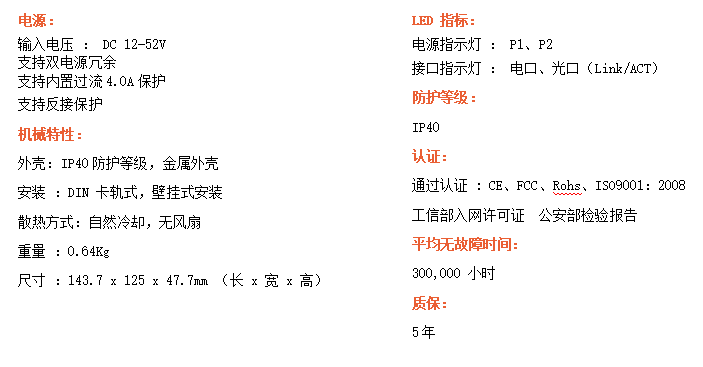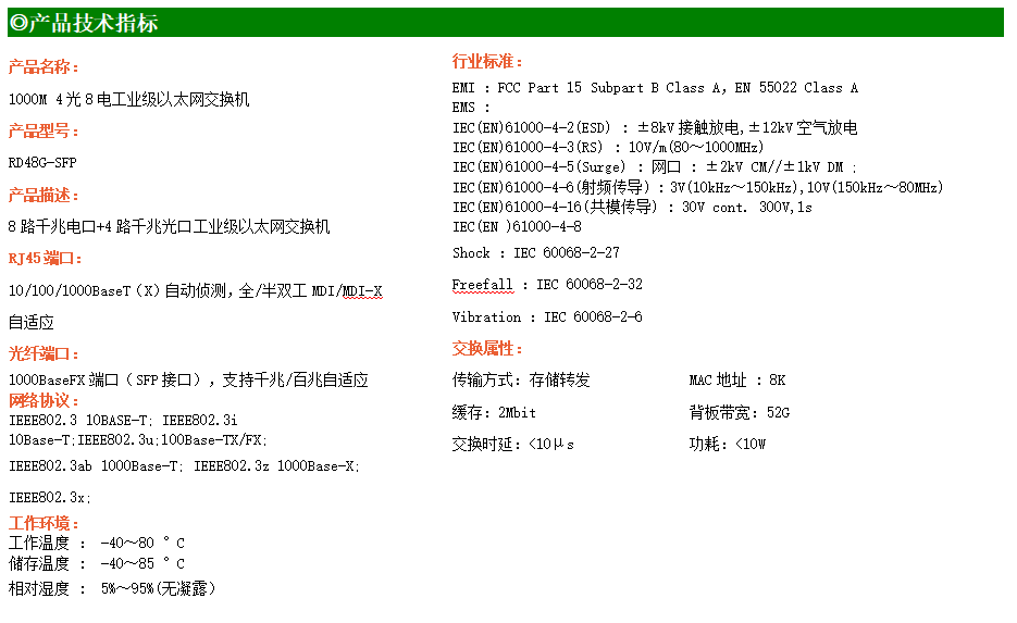 8路千兆電口+4路千兆FX光口工業級以太網交換機,支持8個100Base-T/1000Base-TX電口和4個1000Base-X光口。產品符合FCC、CE、ROHS標準。RD48G交換機具有-40℃~80℃的工作溫度,具有超強的堅固度能適應各種嚴苛環境,也可以非常方便的安置在空間緊湊的控制箱中。導軌的安裝特性、寬溫操作及擁有IP40防護等級的外殼及LED指示燈,使RD48G成為一個即插即用的工業級設備,為用戶的以太網設備聯網提供可靠、便捷的解決方案。