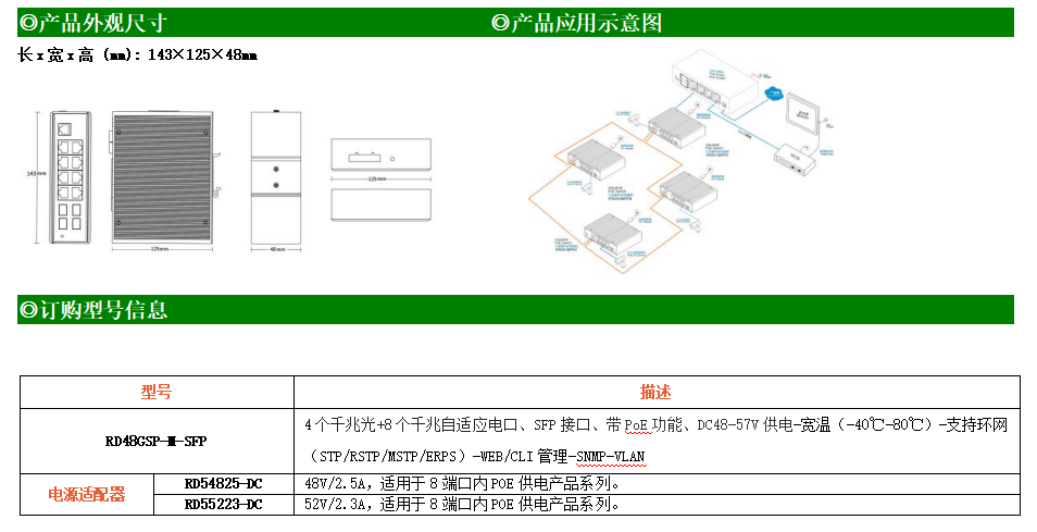 RD48GSP-M是網管型工業級以太網PoE交換機,提供4個千兆光口和8個千兆電口支持8路PoE,支持工業現場所需的以太網二層協議,保證通信網絡的穩定性;該系列交換機采用低功耗、無風扇設計,確保無噪聲干擾,同時支持-40~80℃工作溫度和良好的EMC電磁兼容性能,保證在惡劣的工業環境中保持穩定的工作,為工廠自動化,智能交通,視頻監控等工業應用領域組建快速穩定的網絡終端接入網絡提供安全可靠的解決方案。