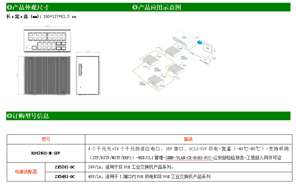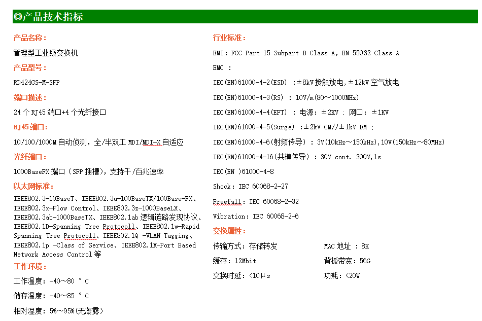 RD424GS-M-SFP是網(wǎng)管型工業(yè)以太網(wǎng)交換機(jī),產(chǎn)品符合FCC、CE、RoHS標(biāo)準(zhǔn)。支持4個千兆光口和24個千兆電口;支持工業(yè)現(xiàn)場所需的以太網(wǎng)二層協(xié)議,保證通信網(wǎng)絡(luò)的穩(wěn)定性;該系列交換機(jī)采用低功耗、無風(fēng)扇設(shè)計(jì),確保無噪聲干擾,同時支持-40~80℃工作溫度和良好的EMC電磁兼容性能,保證在惡劣的工業(yè)環(huán)境中保持穩(wěn)定的工作,為工廠自動化,智能交通,視頻監(jiān)控等工業(yè)應(yīng)用領(lǐng)域組建快速穩(wěn)定的網(wǎng)絡(luò)終端接入網(wǎng)絡(luò)提供安全可靠的解決方案。