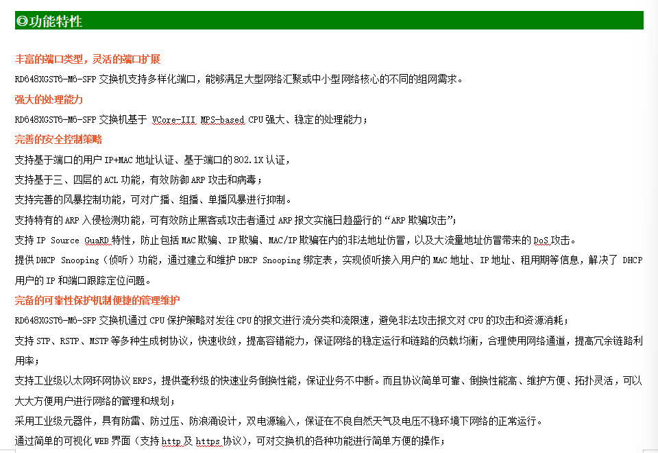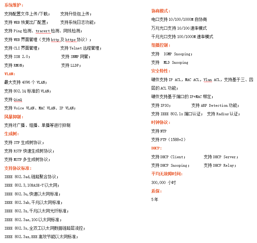 ●網(wǎng)絡(luò)冗余:支持STP/RSTP/MSTP,支持ERPS(自愈時間<20ms)