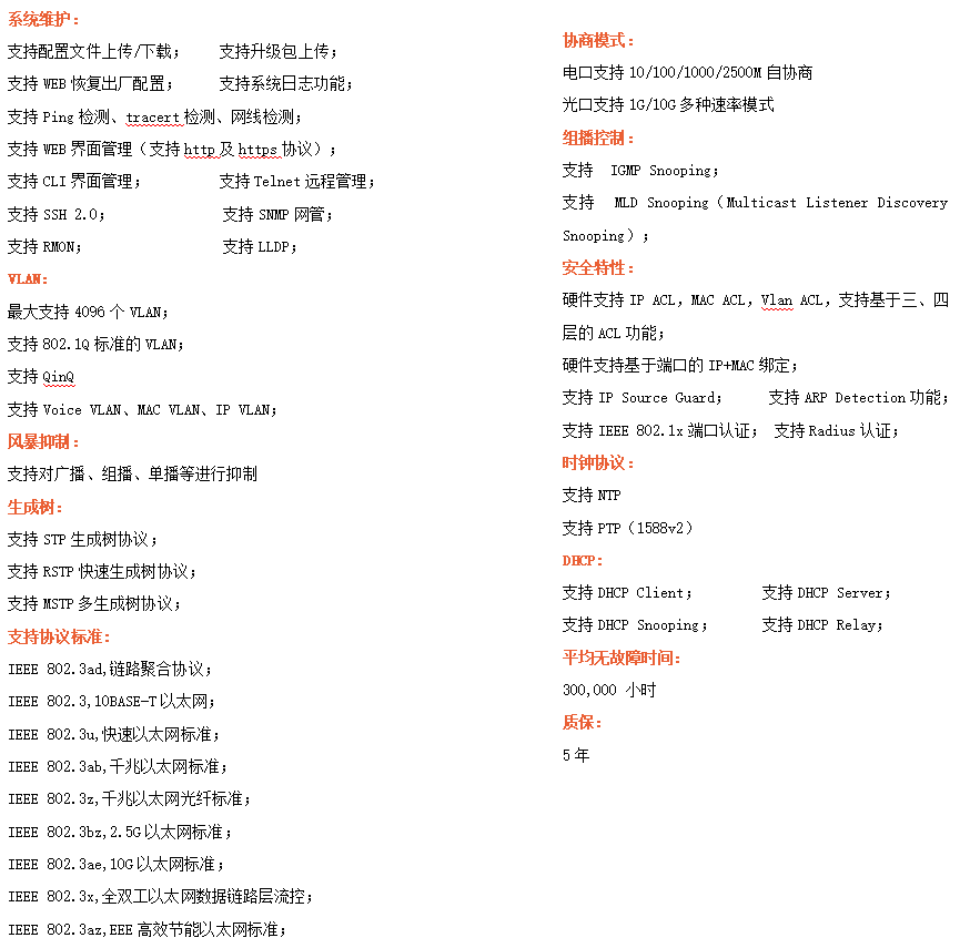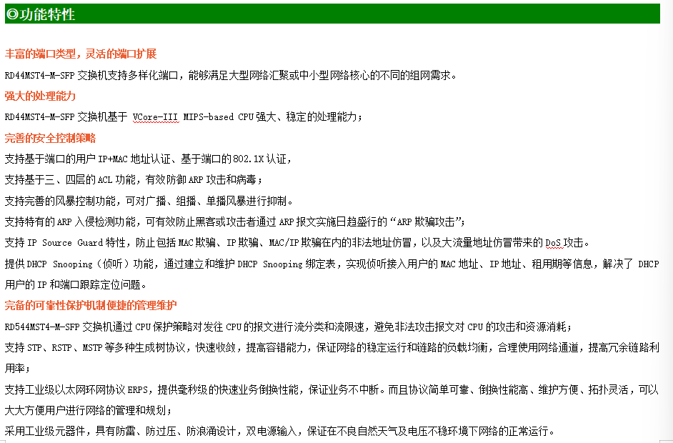 ●網絡冗余:支持STP/RSTP/MSTP,支持ERPS(自愈時間<20ms)