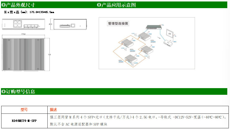 RD44MST4-M-SFP交換機是我司推出的一款萬兆三層交換機,配備4個萬兆SFP+光口和4個10M/100M/1000M/2500M Base-T自適應電口,具備先進的硬件處理能力和最豐富的業務特性。支持IPv4/IPv6 硬件雙棧及線速轉發,使客戶能夠從容應對即將帶來的IPv6 時代其提供高容量的交換能力。RD44MST4-M-SFP交換機具有-40℃~80℃的工作溫度,具有超強的堅固度能適應各種嚴苛環境。導軌式安裝特性、寬溫操作,使RD44MST4-M-SFP的交換機成為一個即插即用的工業級設備,為用戶的以太網設備聯網提供可靠、便捷的解決方案。