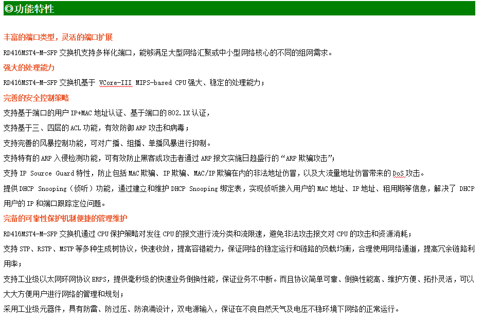 ●網絡冗余:支持STP/RSTP/MSTP,支持ERPS(自愈時間<20ms)