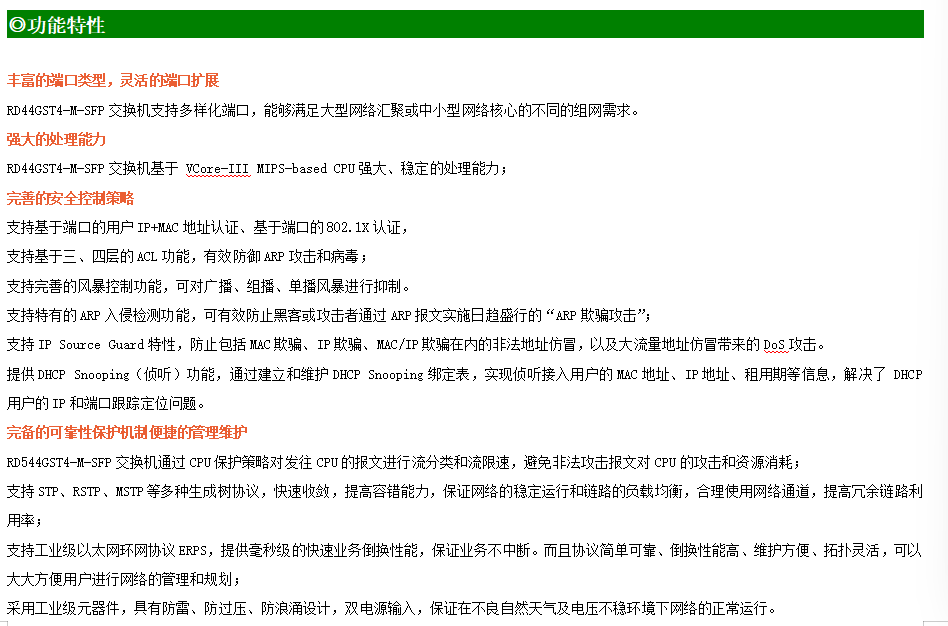 ●網絡冗余:支持STP/RSTP/MSTP,支持ERPS(自愈時間<20ms)