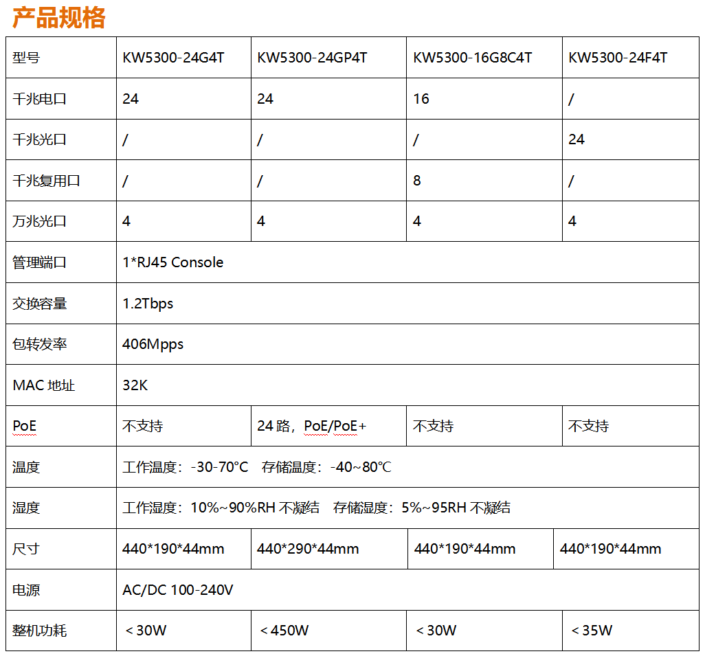 全新開(kāi)發(fā)推出的KW5300系列全千兆網(wǎng)管寬溫交換機(jī),采用新一代高性能硬件和軟件平臺(tái),提供靈活、高性?xún)r(jià)比的全千兆接入和上行端口,支持完備的安全防護(hù)機(jī)制、完善的ACL/QoS策略和靈活的VLAN功能,易于管理維護(hù),滿足用戶(hù)對(duì)于網(wǎng)絡(luò)設(shè)備易管理、高安全、高性能、低成本的組網(wǎng)需求,專(zhuān)為市政、銀行、教育、醫(yī)院、酒店、網(wǎng)吧、數(shù)據(jù)中心等室內(nèi)項(xiàng)目以及戶(hù)外新基建項(xiàng)目定制系列,能滿足大規(guī)模的市場(chǎng)需求。