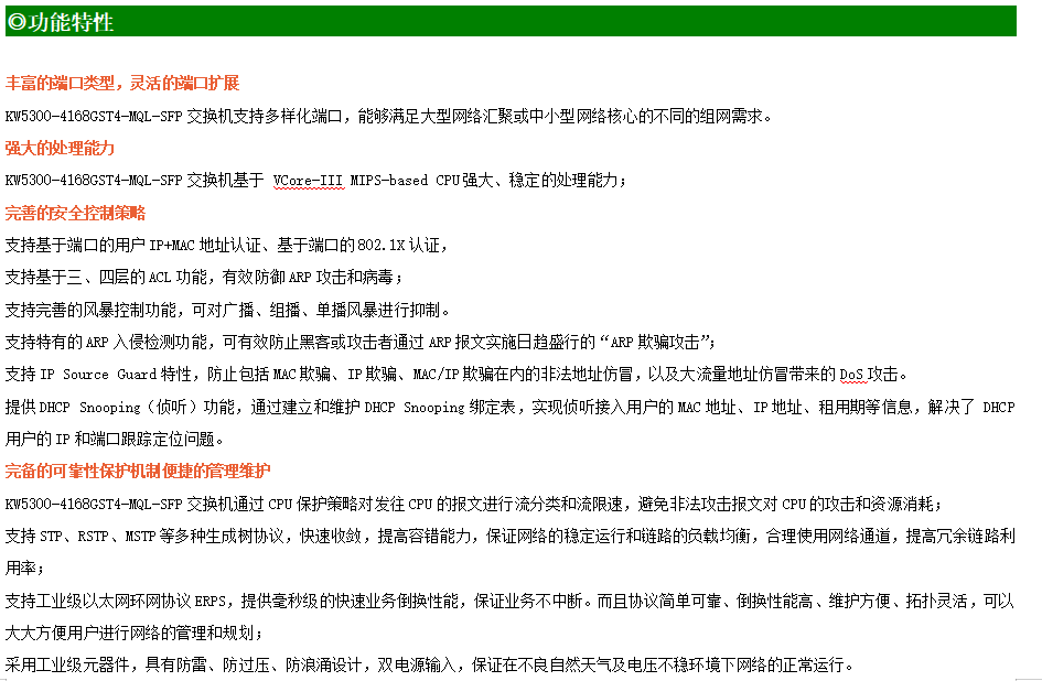 ●網(wǎng)絡(luò)冗余:支持STP/RSTP/MSTP,支持ERPS(自愈時間<20ms)