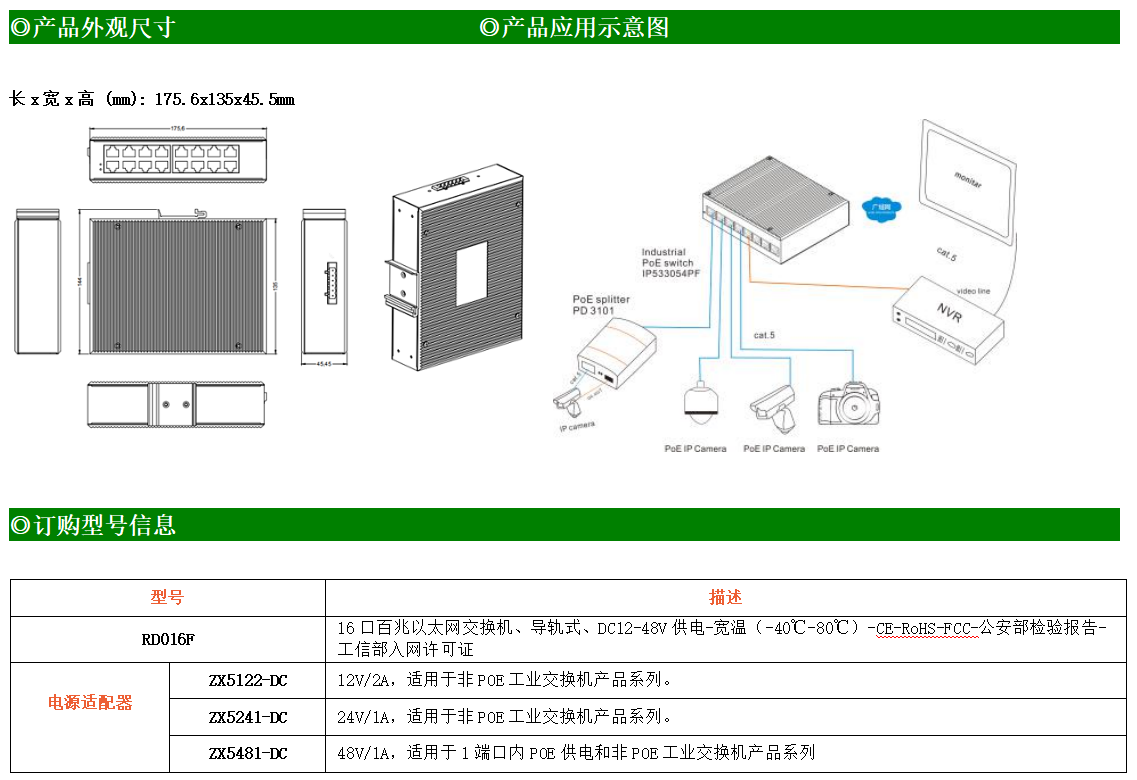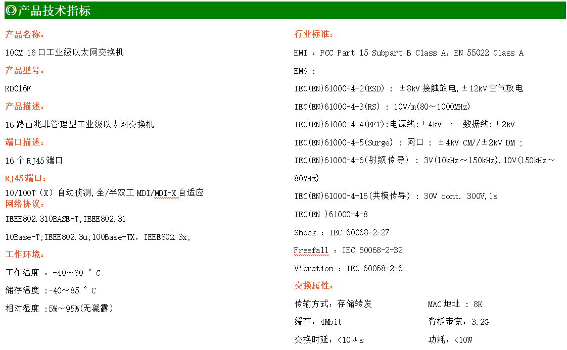 16路百兆電口工業(yè)級以太網(wǎng)交換機,支持16個10Base-T/100Base-TX電口。產(chǎn)品符合FCC、CE、ROHS標準。RD016F交換機具有-40℃~80℃的工作溫度,具有超強的堅固度能適應各種嚴苛環(huán)境,也可以非常方便的安置在空間緊湊的控制箱中。導軌的安裝特性、寬溫操作及擁有IP40防護等級的外殼及LED指示燈,使RD016F成為一個即插即用的工業(yè)級設備,為用戶的以太網(wǎng)設備聯(lián)網(wǎng)提供可靠、便捷的解決方案。