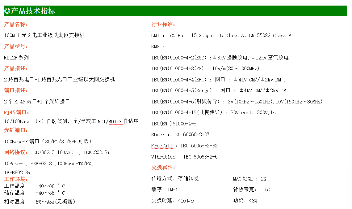 2路百兆電口+1路百兆FX光口工業級以太網交換機,支持2個10Base-T/100Base-TX電口和1個100Base-X光口。產品符合FCC、CE、ROHS標準。RD12F系列交換機具有-40℃~80℃的工作溫度,具有超強的堅固度能適應各種嚴苛環境,也可以非常方便的安置在空間緊湊的控制箱中。導軌的安裝特性、寬溫操作及擁有IP40防護等級的外殼及LED指示燈,使RD12F成為一個即插即用的工業級設備,為用戶的以太網設備聯網提供可靠、便捷的解決方案。