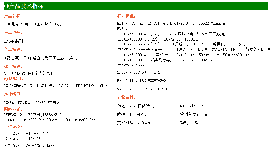 8路百兆電口+1路百兆FX光口工業(yè)級以太網(wǎng)交換機,支持8個10/100Base-TX電口和1個100Base-X光口。產(chǎn)品符合FCC、CE、ROHS標準。RDL18F交換機具有-40℃~75℃的工作溫度,具有超強的堅固度能適應各種嚴苛環(huán)境,也可以非常方便的安置在空間緊湊的控制箱中。導軌的安裝特性、寬溫操作及擁有IP40防護等級的外殼及LED指示燈,使RDL18F成為一個即插即用的工業(yè)級設備,為用戶的以太網(wǎng)設備聯(lián)網(wǎng)提供可靠、便捷的解決方案。