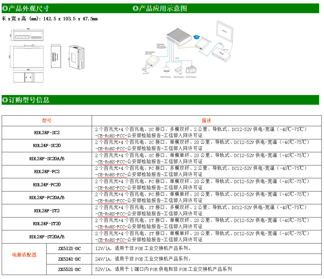 4路百兆電口+2路百兆FX光口工業級以太網交換機,支持4個10Base-T/100Base-TX電口和2個100Base-X光口。產品符合FCC、CE、ROHS標準。RDL24F系列交換機具有-40℃~75℃的工作溫度,具有超強的堅固度能適應各種嚴苛環境,也可以非常方便的安置在空間緊湊的控制箱中。導軌的安裝特性、寬溫操作及擁有IP40防護等級的外殼及LED指示燈,使RDL24F成為一個即插即用的工業級設備,為用戶的以太網設備聯網提供可靠、便捷的解決方案。