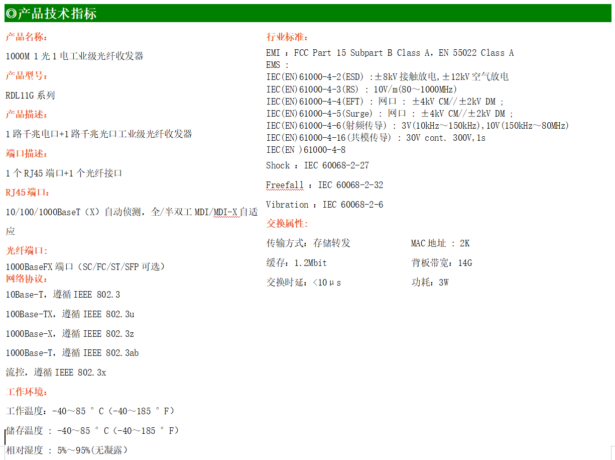 1路千兆電口+1路千兆FX光口工業(yè)級以太網(wǎng)交換機,支持1個10Base-T/100Base-T/1000Base-TX電口和1個1000Base-X光口。產(chǎn)品符合FCC、CE、ROHS標(biāo)準(zhǔn)。RDL11G系列交換機具有-40℃~75℃的工作溫度,具有超強的堅固度能適應(yīng)各種嚴(yán)苛環(huán)境,也可以非常方便的安置在空間緊湊的控制箱中。導(dǎo)軌的安裝特性、寬溫操作及擁有IP40防護等級的外殼及LED指示燈,使RDL11G成為一個即插即用的工業(yè)級設(shè)備,為用戶的以太網(wǎng)設(shè)備聯(lián)網(wǎng)提供可靠、便捷的解決方案。