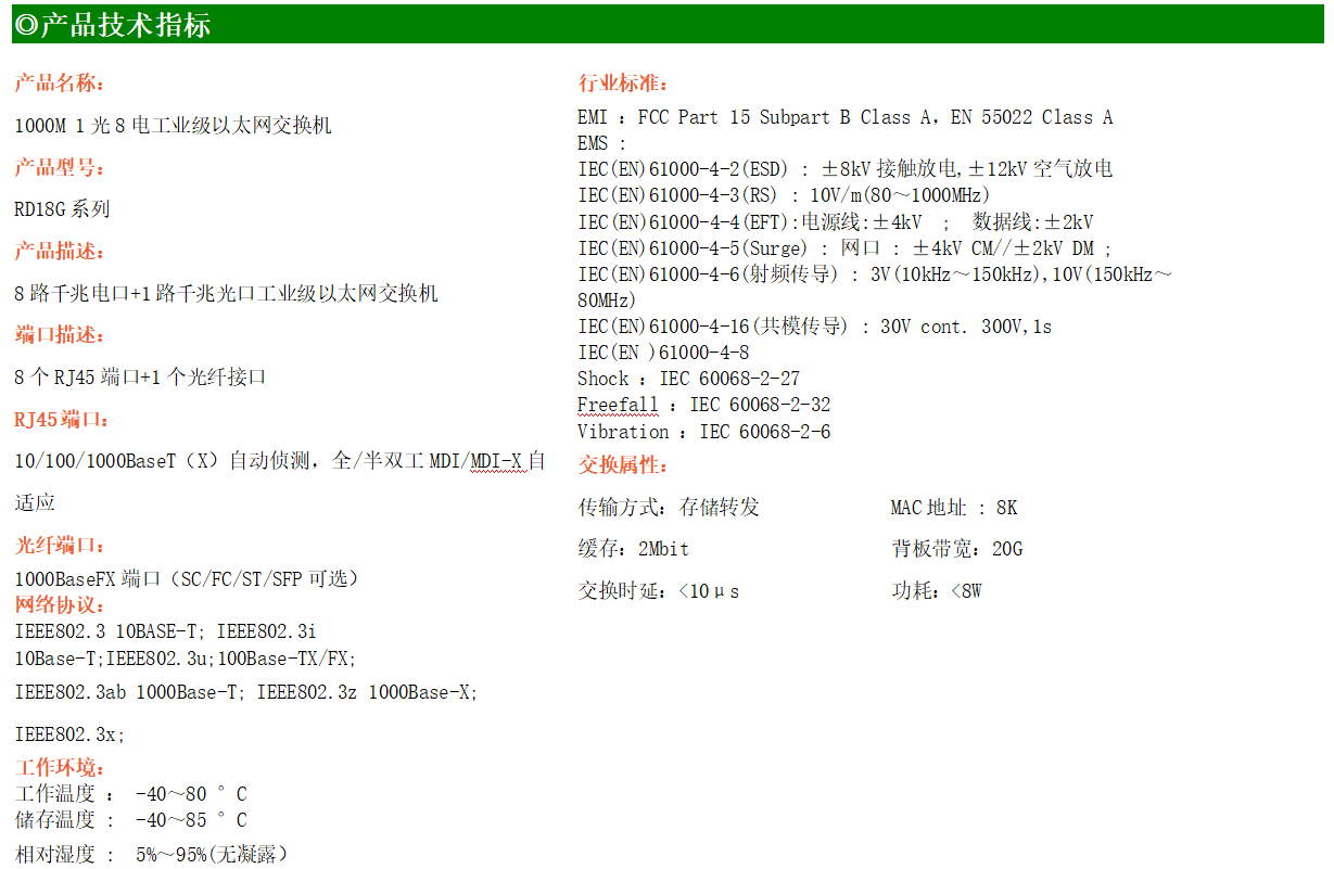 8路千兆電口+1路千兆FX光口工業(yè)級以太網(wǎng)交換機(jī),支持8個100Base-T/1000Base-TX電口和1個1000Base-X光口。產(chǎn)品符合FCC、CE、ROHS標(biāo)準(zhǔn)。RD18G系列交換機(jī)具有-40℃~80℃的工作溫度,具有超強(qiáng)的堅固度能適應(yīng)各種嚴(yán)苛環(huán)境,也可以非常方便的安置在空間緊湊的控制箱中。導(dǎo)軌的安裝特性、寬溫操作及擁有IP40防護(hù)等級的外殼及LED指示燈,使RD18G系列成為一個即插即用的工業(yè)級設(shè)備,為用戶的以太網(wǎng)設(shè)備聯(lián)網(wǎng)提供可靠、便捷的解決方案。