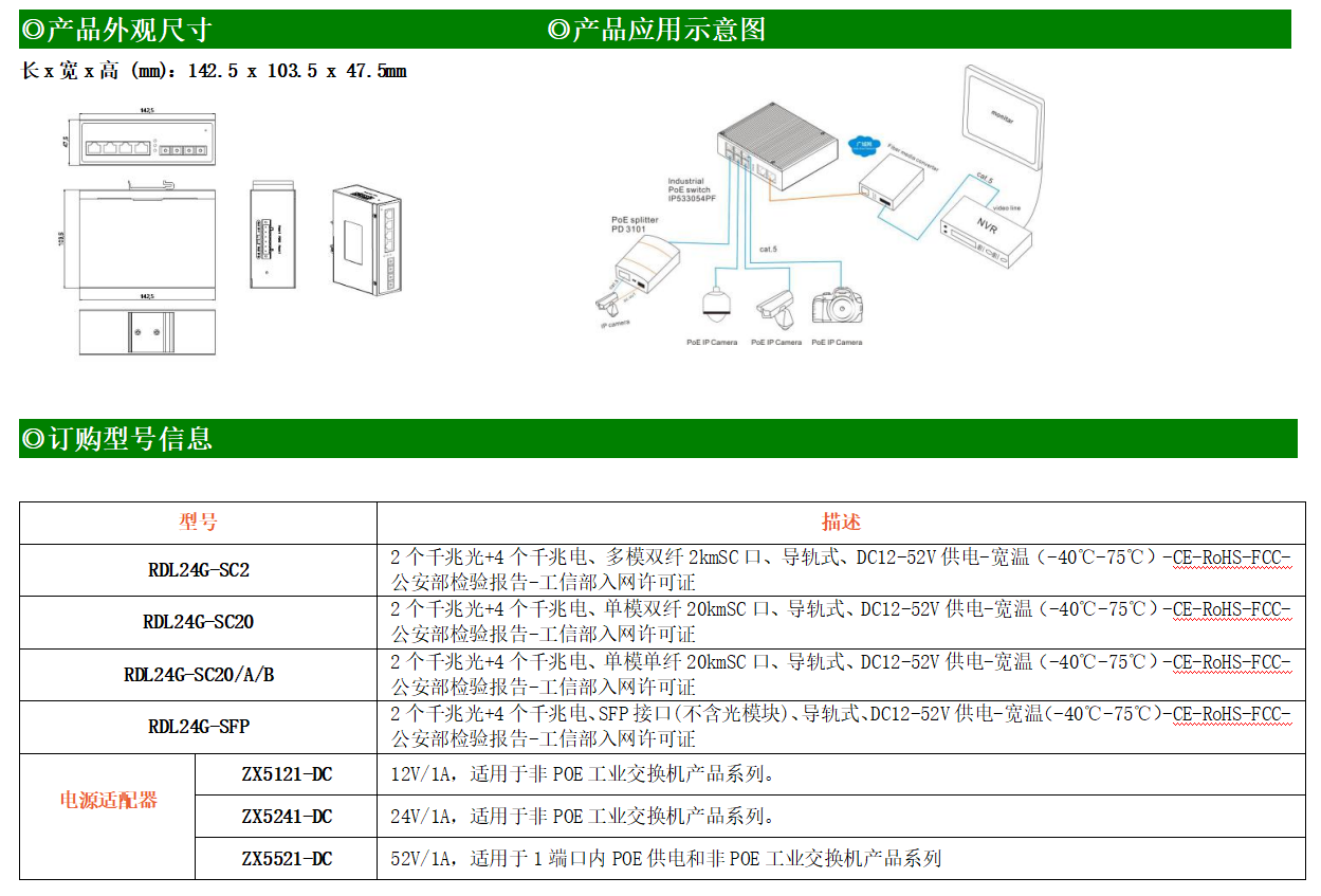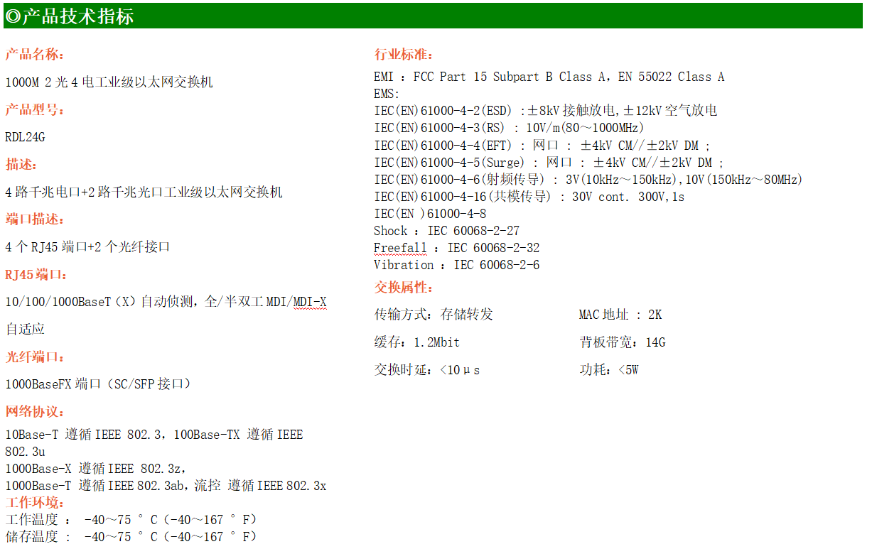 4路千兆電口+2路千兆FX光口工業(yè)級以太網(wǎng)交換機(jī),支持4個100Base-T/1000Base-TX電口和2個1000Base-X光口。產(chǎn)品符合FCC、CE、ROHS標(biāo)準(zhǔn)。RDL24G交換機(jī)具有-40℃~75℃的工作溫度,具有超強(qiáng)的堅固度能適應(yīng)各種嚴(yán)苛環(huán)境,也可以非常方便的安置在空間緊湊的控制箱中。導(dǎo)軌的安裝特性、寬溫操作及擁有IP40防護(hù)等級的外殼及LED指示燈,使RDL24G成為一個即插即用的工業(yè)級設(shè)備,為用戶的以太網(wǎng)設(shè)備聯(lián)網(wǎng)提供可靠、便捷的解決方案。