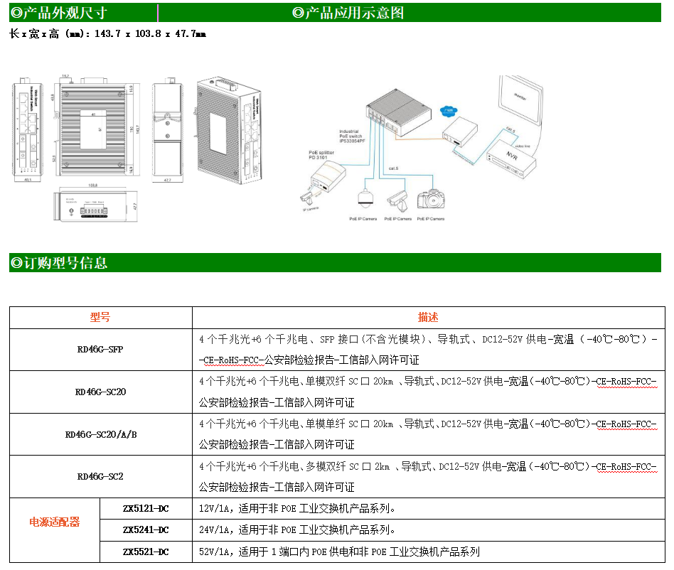 6路千兆電口+4路千兆光口工業級以太網交換機,支持6個10/100/1000Base-T(x)電口和4個1000Base-X光口。產品符合FCC、CE、ROHS標準。RD46G交換機具有-40℃~80℃的工作溫度,具有超強的堅固度能適應各種嚴苛環境,也可以非常方便的安置在空間緊湊的控制箱中。導軌的安裝特性、寬溫操作及擁有IP40防護等級的外殼及LED指示燈,使RD46G成為一個即插即用的工業級設備,為用戶的以太網設備聯網提供可靠、便捷的解決方案。